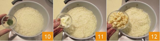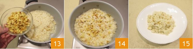 e de panetone (13-14); misture com uma colher para que a fontina derreta, dando sabor ao risoto. Sirva o risoto de panetone bem quente 15!