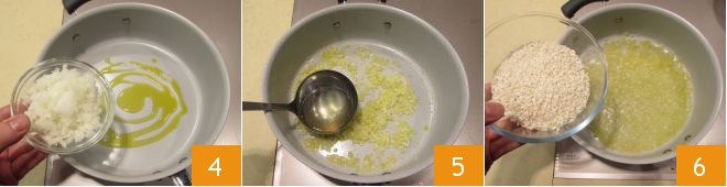 aqueça um fio de azeite de oliva em uma panela, adicione a cebola picada 4 e deixe-a murchar em fogo baixo, depois despeje uma concha de Caldo de legumes 5 e, após alguns minutos, adicione também o arroz 6.