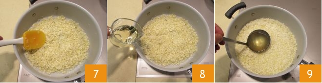 Toque o arroz por alguns minutos 7 e depois regue com espumante ou vinho branco 8. Continue cozinhando adicionando o caldo 9, uma concha de cada vez, até que o arroz esteja cozido: levará cerca de 20 minutos.