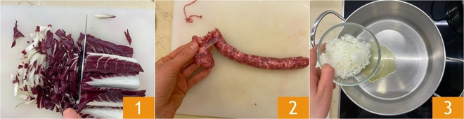 Para preparar o risoto com radicchio e linguiça, corte o radicchio em tiras finas 1, remova a pele da linguiça e esfarele-a 2. Despeje o azeite de oliva em uma panela, adicione a cebola picada e deixe amolecer em fogo baixo 3.