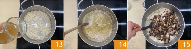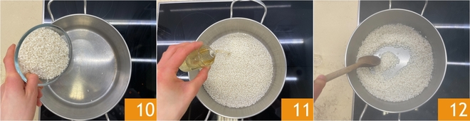 Em uma panela, adicione o arroz carnaroli e deixe tostar 10. Quando os grãos estiverem bem quentes, adicione o vinho branco 11. Deixe o álcool evaporar mantendo o fogo médio-alto 12.