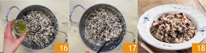 Finalize com o azeite de oliva 16. Ajuste o sal e a pimenta, dê uma última mexida com uma espátula 17 e seu risoto com radicchio e linguiça está pronto para ser saboreado 18!