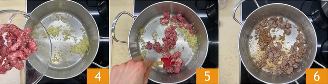 Após cerca de 3 minutos, adicione a linguiça sem a pele 4. Mantenha a temperatura média-alta e, com uma espátula, mexa frequentemente 5. Continue a cozinhar por cerca de 7 minutos ou até que esteja bem dourada 6.
