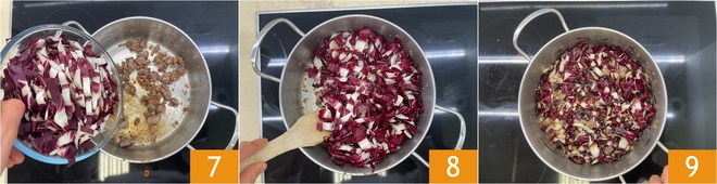 Neste ponto, você pode adicionar o radicchio cortado em tiras 7. Mexa bem com uma colher 8, deixe cozinhar por mais 3 minutos e reserve 9.