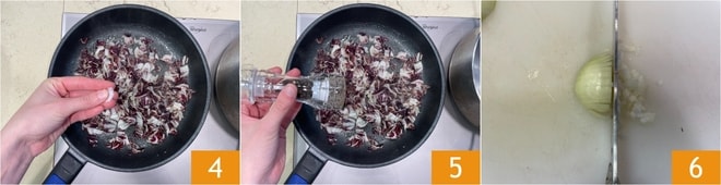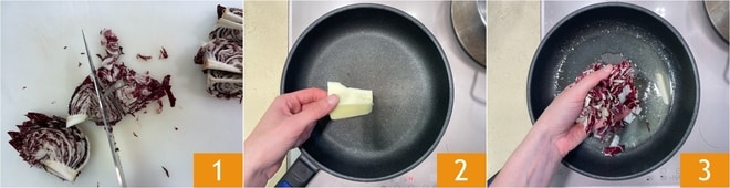 Para preparar o risoto de radicchio, primeiro você deve deixar o caldo de legumes quente de lado. Depois, lave e corte o radicchio em tiras (reserve algumas tiras cruas para decorar os pratos) 1. Em uma frigideira, derreta 20 g de manteiga 2 e adicione o restante do radicchio 3.