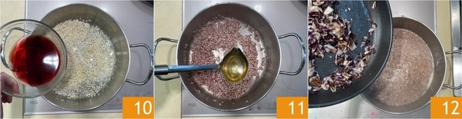 Quando estiver tostado, despeje o vinho tinto 10, deixe o álcool evaporar, e então comece a regar com o caldo de legumes quente 11, pouco a pouco, apenas para cobrir, adicionando conforme necessário, para cozinhar o risoto. No final do cozimento, adicione o radicchio que você refogou 12.