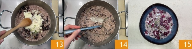 Misture bem com mais 20 g de manteiga, o Grana Padano DOP e perfume com tomilho fresco 13. Sirva o risoto de radicchio 14, complete com o radicchio fresco reservado 15.
