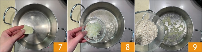 Separadamente, em uma panela, derreta mais 20 g de manteiga 7, adicione a cebola picada 8 e deixe refogar, mexendo frequentemente, até ficar macia. Adicione o arroz 9 e toste por alguns minutos na panela, mexendo.