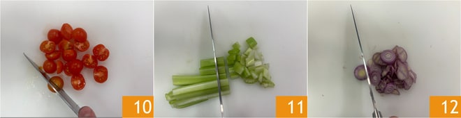 Divida ao meio os tomatinhos 10, depois corte em pedaços a haste do aipo 11 e as chalotas 12.