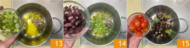 Comece a preparar o caldo: em uma panela com um fio de óleo coloque as chalotas e o aipo 13. Adicione as cenouras 14, os ramos de manjerona e os tomatinhos 15. Deixe tostar por alguns minutos.