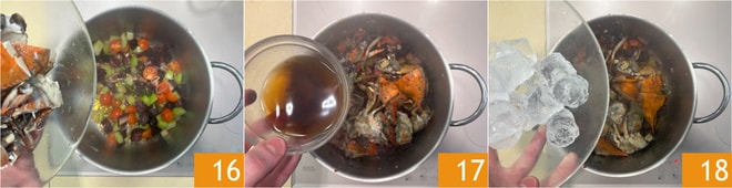 Adicione então os carapaças dos siris 16 e doure por alguns minutos em fogo médio. Refogue com o rum 17 e, quando toda a parte alcoólica tiver evaporado, adicione o gelo 18.