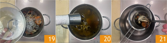 Cubra com água fria 19, depois ajuste o sal e a pimenta 20. Cozinhe por 30 minutos ou até que o líquido tenha reduzido pela metade. Coe o caldo 21 e mantenha-o aquecido.