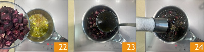 Passe para o creme de cenouras roxas: em uma panela coloque um fio de óleo, adicione a chalota restante e deixe refogar. Adicione as cenouras 22, regue com o caldo de siri 23, salgue e apimente 24. Cozinhe até que as cenouras fiquem macias.