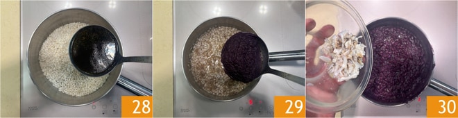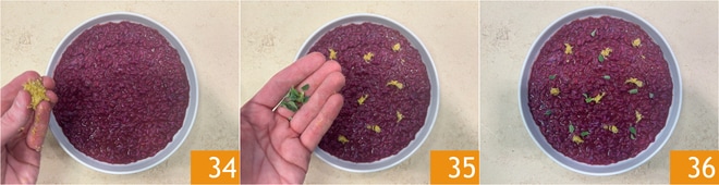 Agora você pode começar a cozinhar o risoto: em uma panela coloque o arroz, adicione uma pitada de sal e torre a seco por alguns minutos. Regue com o caldo de siri 28 e termine de cozinhar o arroz dessa forma, adicionando uma concha de cada vez assim que o líquido for absorvido. Quando faltarem 2 minutos para o término do cozimento, adicione o creme de cenouras roxas 29. Desligue o fogo e misture adicionando a polpa de siri 30.