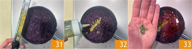 Complete com a casca ralada de cidra 31, um fio de óleo 32 e manjerona 33.