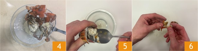 Transfira os siris para uma tigela com água e gelo 4. Neste ponto, retire as vísceras e, com uma colher, retire a polpa do carapaça 5. Abra as pinças e retire a polpa também delas 6. Reserve tanto as carcaças quanto a polpa.