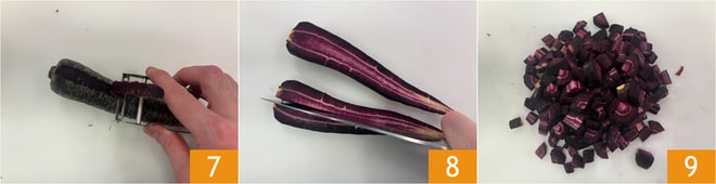 Prepare os ingredientes que você precisará para o caldo e para o creme, mantendo-os separados: descasque as cenouras roxas 7 e corte-as primeiro em tiras 8 e depois em pedaços 9.