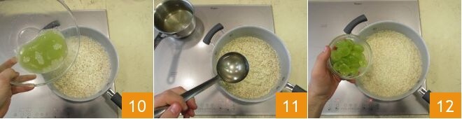 Deixe tostar por alguns minutos: assim que os grãos ficarem transparentes, você poderá flambar com o suco de uva 10. Uma vez seco, adicione o caldo de legumes quente e já salgado em conchas até finalizar o cozimento. Lembre-se de não mexer muito o arroz 11. Ao final do cozimento, desligue o fogo e misture o risoto adicionando os bagos de uva sem sementes, cortados alguns ao meio e outros em quartos 12,