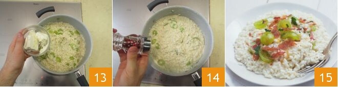 depois a robiola, uma pitada de pimenta rosa e misture bem 14. Coloque nos pratos e depois decore cada prato com um pouco de presunto cru quebrado à mão e salsa picada. O seu risoto de uva está pronto, bom apetite!