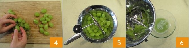 Continue enxaguando as uvas, depois destaque os bagos 4 e coloque-os em um passa-verduras 5; lembre-se de deixar alguns de lado para a decoração. Passe os outros para obter o suco e reserve 6.