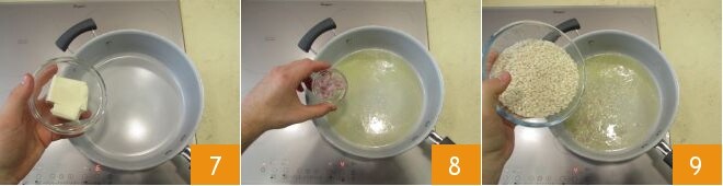 Coloque a manteiga para derreter em uma panela grande em fogo bem baixo 7 e depois adicione a cebola picada, deixando-a murchar por cerca de dez minutos 8. Mexa frequentemente nesta fase. Se secar muito rápido, adicione algumas colheres de caldo quente. Passado o tempo, aumente um pouco o fogo e adicione o arroz 9.