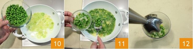 Em outra panela, deixe dourar a outra metade do alho-poró com um fio de azeite de oliva, deixe amaciar em fogo baixo por 5 minutos, adicione as ervilhas 10 e continue cozinhando adicionando o caldo aos poucos para não secar os legumes. Cozinhe por 10-15 minutos e depois retire 3-4 colheres de sopa de ervilhas 11, transfira para um recipiente alto e estreito e bata com o mixer de imersão 12