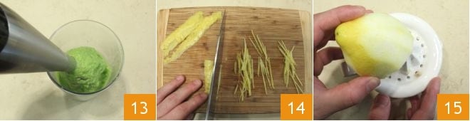 para obter um creme homogêneo 13. Enquanto o arroz continua cozinhando, prepare as lulas: corte a casca do limão em tiras 14 e esprema o suco 15.