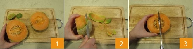 Para preparar o risoto de presunto e melão, comece removendo as extremidades do melão e cortando-o ao meio 1. Remova a casca externa com uma faca 2 e divida novamente cada metade em 2 partes iguais 3.