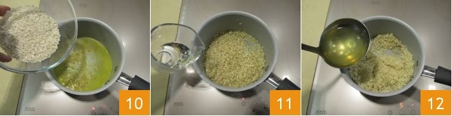 Quando estiver murcha, adicione o arroz 10 e deixe tostar por alguns minutos. Em seguida, adicione o vinho branco 11. Quando o vinho evaporar, acrescente uma concha de Caldo de legumes 12. Mexa o risoto de vez em quando e continue a adicionar uma concha de caldo apenas quando a anterior for totalmente absorvida.