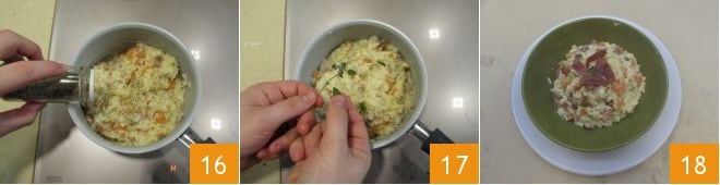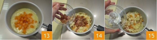 Quando a cocção estiver quase completa, adicione o melão 13 e o presunto 14, reservando alguns pedaços para a decoração final, e misture tudo. Assim que o risoto estiver cozido, retire do fogo e adicione a stracciatella para dar cremosidade 15, continuando a mexer até que ela derreta, para obter um risoto cremoso.