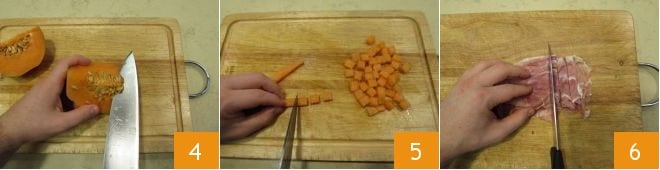 Retire a parte interna com as sementes 4 e corte fatias não muito grossas que você cortará em cubos de cerca de meio centímetro 5. Reserve e, enquanto isso, pegue o presunto e corte-o em tiras de cerca de 1 cm de espessura 6.