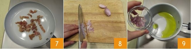 Deixe-as dourar em uma frigideira antiaderente por alguns minutos sem adicionar óleo 7: assim que uma leve crosta se formar na superfície, estarão prontas. Agora pique finamente a cebola 8. Coloque-a em uma panela grande e deixe dourar com um fio de azeite 9.