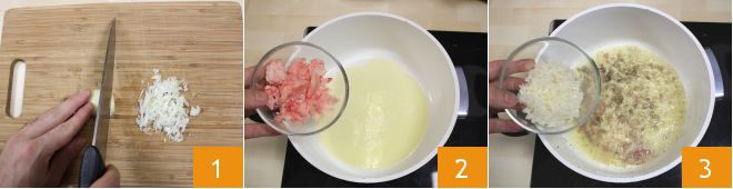 Para preparar o risoto ao Amarone, comece picando finamente a cebola chalota 1. Em uma panela, derreta 30 g de manteiga junto com o tutano de boi 2, adicione a cebola chalota e deixe-a murchar com uma concha de caldo de carne 3.
