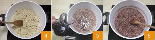 Adicione o arroz e deixe-o tostar bem 4, em seguida, despeje o Amarone aos poucos em duas ou três vezes, esperando que o vinho já adicionado seja bem absorvido 5. Isso levará pelo menos 5 minutos, durante os quais você mexerá com uma colher de pau 6.