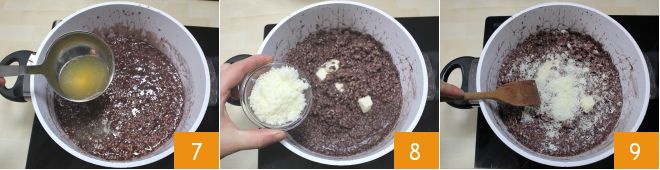 Continue cozinhando o risoto em fogo baixo, adicionando o caldo de carne uma concha de cada vez 7. Quando o arroz estiver al dente, desligue o fogo e finalize o risoto com os restantes 30 g de manteiga e com o queijo Monte Veronese ralado 8, misturando com a colher 9. O risoto ao Amarone está pronto para ser servido!