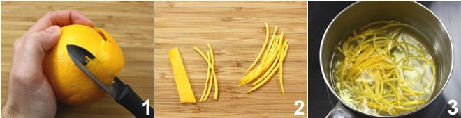 Para preparar o risoto de laranja, comece lavando a laranja e retirando a casca com um descascador de batatas 1, cuidando para remover o mínimo possível da parte branca (que seria amarga); esprema a laranja e reserve o suco. Corte a casca removida em raspas (palitos) bem finos 2 e branquear levemente em uma panela 3 contendo um pouco de água e depois escorra.