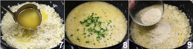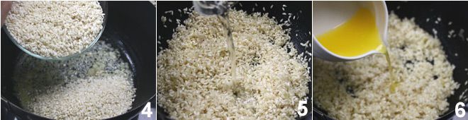 Descasque e pique finamente a cebola, refogue-a na manteiga derretida e depois adicione o arroz 4 que você deve tostar por alguns minutos; regue o arroz com um pouco de vinho branco 5 e depois adicione o suco de laranja 6.