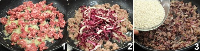 Para preparar o risoto à cerveja com radicchio e linguiça comece cortando finamente o radicchio e picando a cebola. Coloque o óleo e a manteiga em uma panela, deixe derreter, depois adicione a cebola e deixe murchar em fogo baixo por 10-15 minutos. Adicione a linguiça esfarelada 1 e deixe ficar branca, depois adicione o radicchio 2 e deixe murchar em fogo brando, mexendo de vez em quando. Quando o radicchio estiver murcho, adicione o arroz 3 e deixe tostar por um par de minutos
