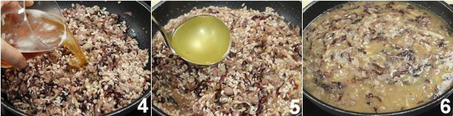 e então adicione a cerveja 4; quando o líquido tiver evaporado, continue o cozimento do risoto adicionando uma concha de caldo de legumes de cada vez até à completa absorção do líquido anterior 5. Cozinhe o arroz até o ponto 6, adicione sal, pimenta e, finalmente, queijo parmesão (ou grana) ralado a gosto, misturando bem. Deixe o risoto à cerveja com radicchio e linguiça descansar por um minuto e depois sirva.