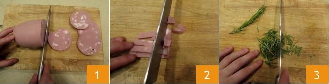 Para preparar o risoto com cerveja e mortadela, coloque no fogo uma panela com bastante água salgada que você usará para o Caldo de legumes. Corte a mortadela em fatias 1 e depois em cubos bem pequenos 2 e reserve. Pique finamente o alecrim 3