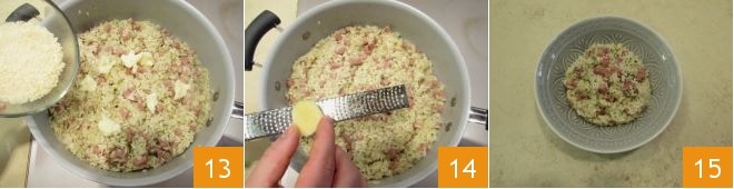 e com o queijo ralado 13, depois adicione o gengibre fresco ralado 14. Emprate o risoto com cerveja e mortadela e sirva bem quente 15!