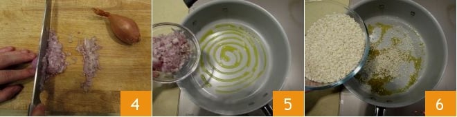 e a cebola echalote 4; refogue a cebola echalote em uma panela antiaderente grande com o azeite 5 depois adicione o arroz 6, deixando-o tostar por 1 minuto.