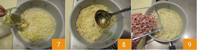 Flambe com a cerveja 7, deixando-a evaporar. Cozinhe o arroz, adicionando de vez em quando uma concha de caldo de legumes 8, até terminar o cozimento: levará cerca de 15 minutos. Na metade do cozimento, adicione a mortadela previamente cortada em cubos 9.