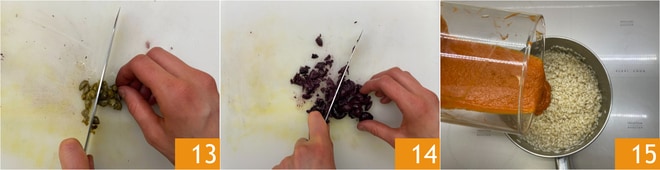 Enquanto isso, pique as alcaparras 13 e as azeitonas 14 e reserve. Quando o arroz estiver cozido pela metade, adicione o molho e finalize o cozimento 15.