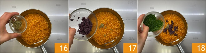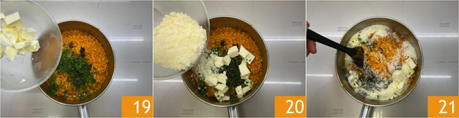 Depois, com o fogo desligado, adicione a manteiga 19, o parmesão 20 e misture bem 21.