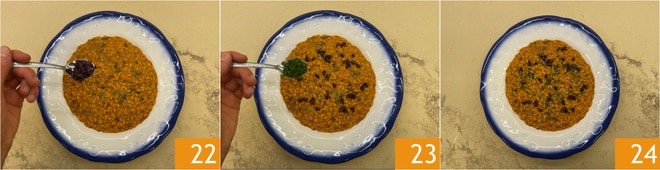 Emprate e complete decorando com alcaparras, azeitonas 22 e salsa 23. O risoto à puttanesca está pronto para ser servido 24.