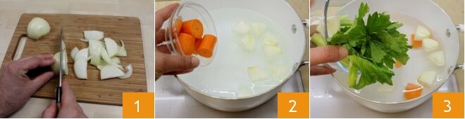 Para preparar o risoto de abóbora com robiola e bacon crocante, comece preparando o Caldo de legumes. Em uma panela grande, coloque a água para ferver; enquanto isso, lave bem todos os vegetais. Descasque uma cebola e corte-a em pedaços 1, depois descasque uma cenoura, removendo as extremidades, e corte-a grosseiramente 2 junto com o aipo. Coloque todos os vegetais 3, ajuste o sal e, quando a água começar a ferver, tampe. Cozinhe por cerca de meia hora e, ao final do cozimento, coe o caldo com uma peneira.