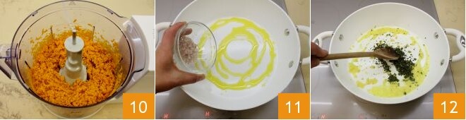 Pique a abóbora até obter uma consistência muito fina 10 e, em seguida, prepare o refogado; em uma panela antiaderente grande, doure a cebola-roxa picada com um fio de azeite 11, adicione o mix de ervas aromáticas que você preparou e cozinhe por 15 minutos em fogo muito baixo, adicionando um pouco de caldo 12.