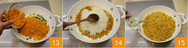 Quando a cebola-roxa estiver bem dourada, adicione a abóbora picada 13; ajuste o sal a seu gosto e adicione o arroz 14, misturando bem com uma colher de pau por alguns minutos para evitar que grude na panela. Doure o arroz e flambe com o vinho branco 15.