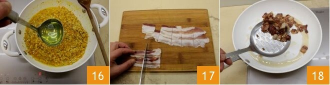Cozinhe por pelo menos 20 minutos e, durante o cozimento, adicione 1-2 conchas de caldo de legumes, sempre que o anterior estiver seco 16. Alguns minutos antes do término do cozimento do risoto, comece a preparar o tempero: corte a robiola em cubos e reserve, depois pegue o bacon, corte em tiras finas e depois em quadradinhos 17; doure em fogo médio em uma panela antiaderente até ficar crocante e dourado 18.